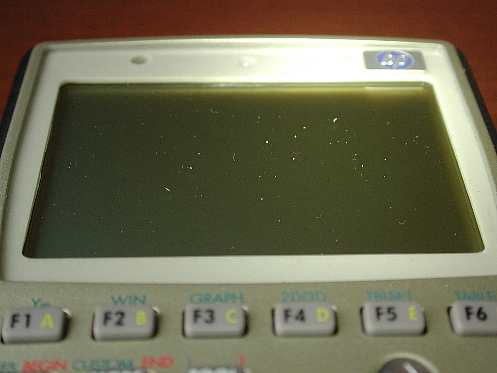 Ever get annoyed by dust that's stuck behind the "dust screen" of your expensive HP calculator? Well, don't get mad; get it out! There's a quick and easy way to remove the dust from the displays of HP49g+ and HP50g calculators. If done as shown, it won't even void the warranty.As a bonus, an optional "dustproofing" technique is included as "Step 3.5" of this article. It renders your dear HP calculator absolutely immune to dust in the future, without ANY visible modification!