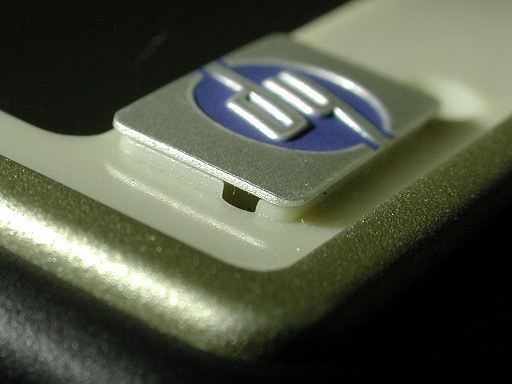 Click Picture For A Pointlessly Larger VersionThe aluminum HP logo sits atop a very short plastic pillar, as you can see. That pillar has a hole that runs all the way from its right side (very visible in the photo above) down to the inside of the calculator. Unfortunately, the logo also pokes through a hole in the dust screen. There is no hermetic seal between that hole and the hole in the logo pillar. And there's a direct dust path from THAT hole to the air between the dust screen and the LCD! This is clearly a case of excellent HP engineering being messed up by forces beyond their control... and possibly even beyond their knowledge.