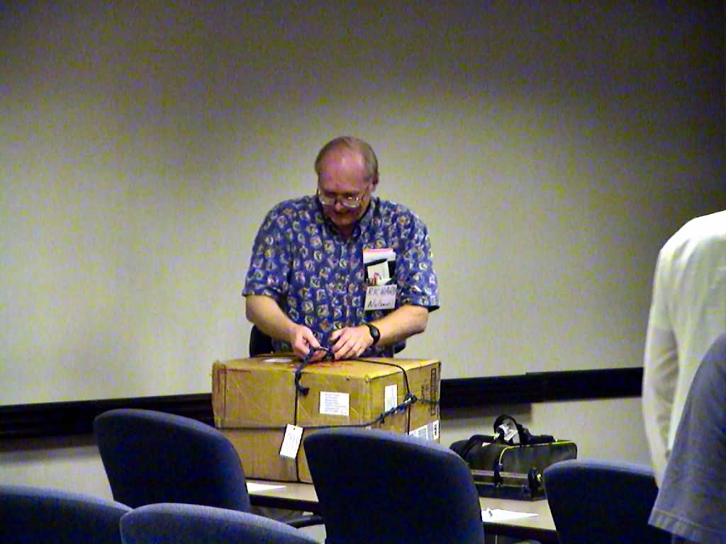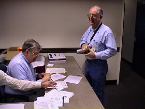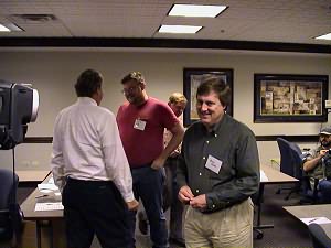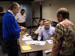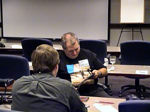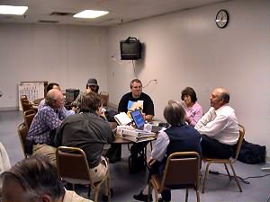Evening session: Dean Lampman (far right) tells the group how he beta-tested the HP65 and almost got sued by HP in the process for making his own mag cards (!) |